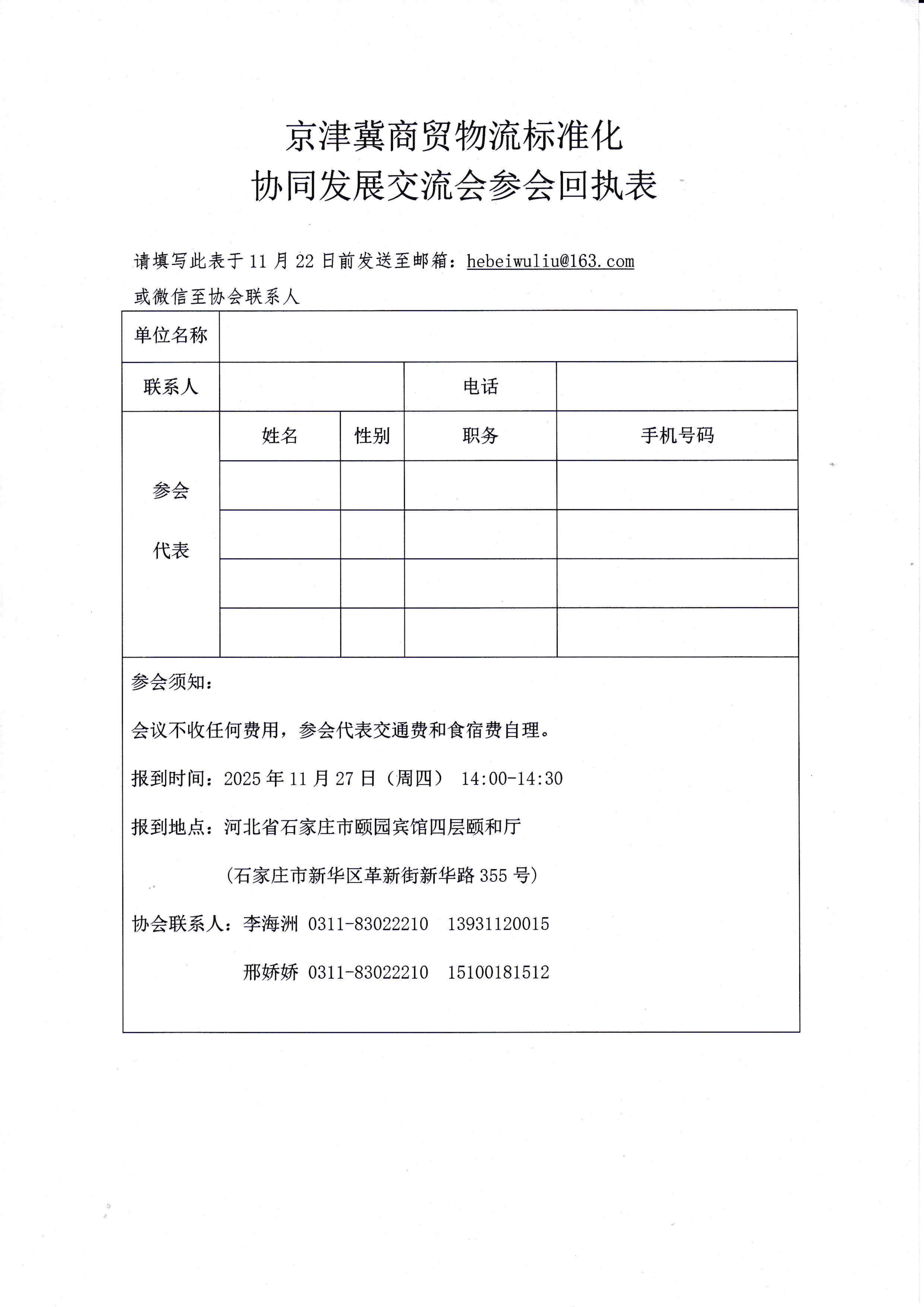 京津冀商贸物流标准化协同发展交流会参会回执表
